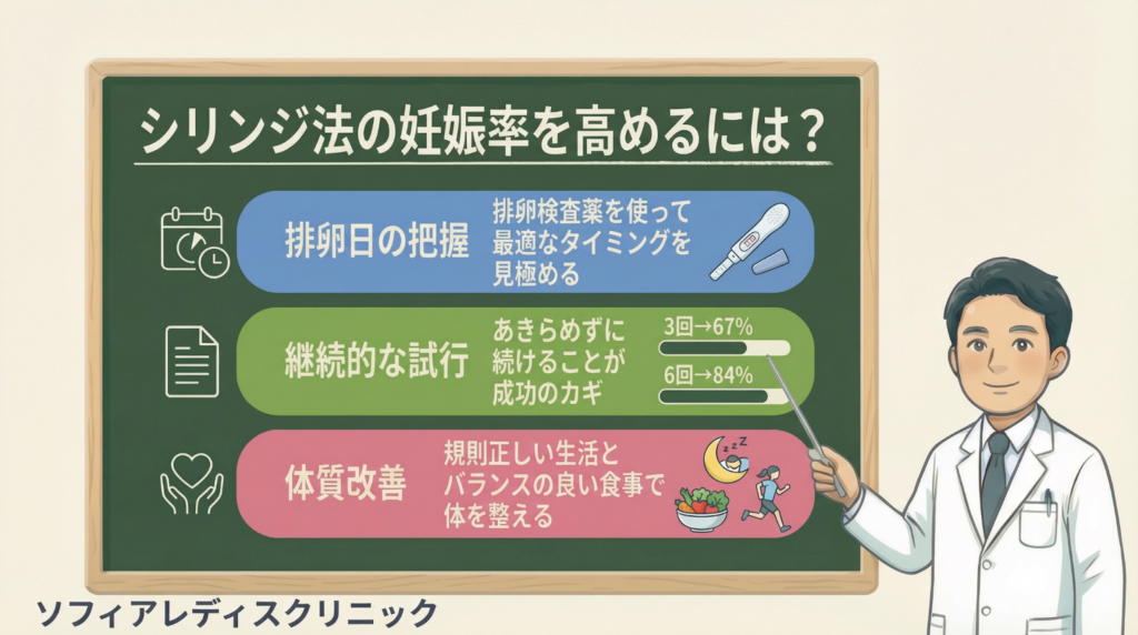 シリンジ法の妊娠率に影響する要因はさまざまです。妊娠率と成功率を上げるポイントを、3つに分けて解説します。