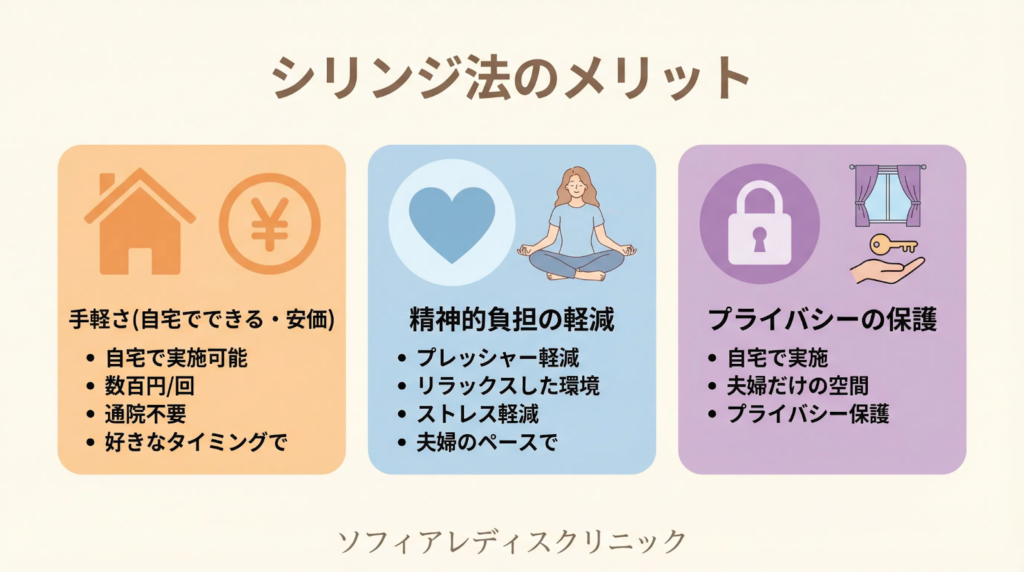 シリンジ法は病院に通院する必要がなく、自宅で、自分たちの好きなタイミングで行えることが大きなメリットです。必要なものも少なく、ドラッグストアやインターネットで購入できます。人工授精のように、病院の予約に合わせて通院する必要もありません。仕事で忙しい方や、通院が難しい方にとって、手軽さは大きな魅力です。