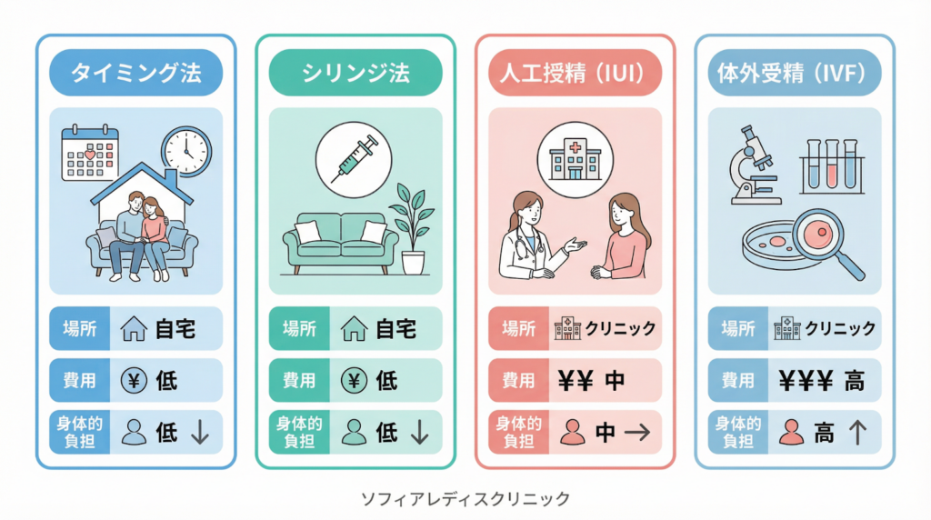 治療法の違いを理解することで、各治療法の利点と制約を把握し、自身のライフスタイルや経済的状況に合った治療法を選択しやすくなります。シリンジ法と他の3つの不妊治療との違いについて解説します。