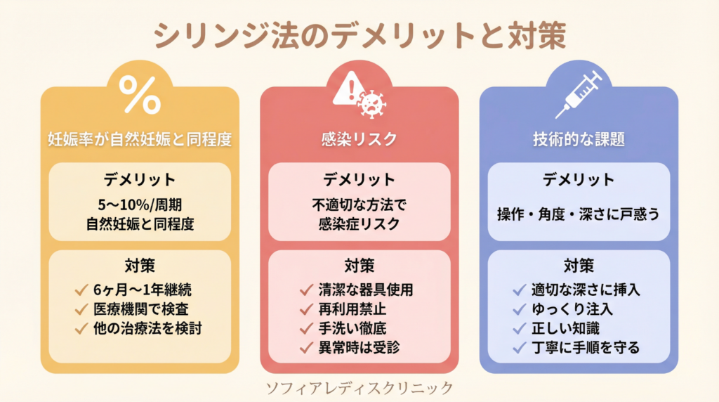 シリンジ法のデメリットは以下の通りです。対策と合わせて解説します。