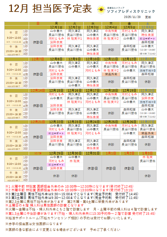 12月 1月 外来担当医表(12/6更新)