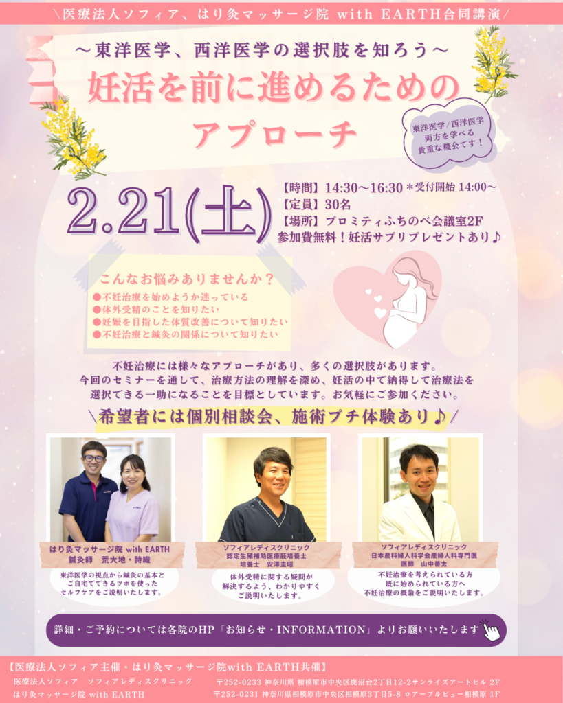 【鍼灸院共催】2/21(土) 不妊治療セミナーを開催します【東洋医学と西洋医学の両方を知る貴重な機会です。是非ご参加ください】